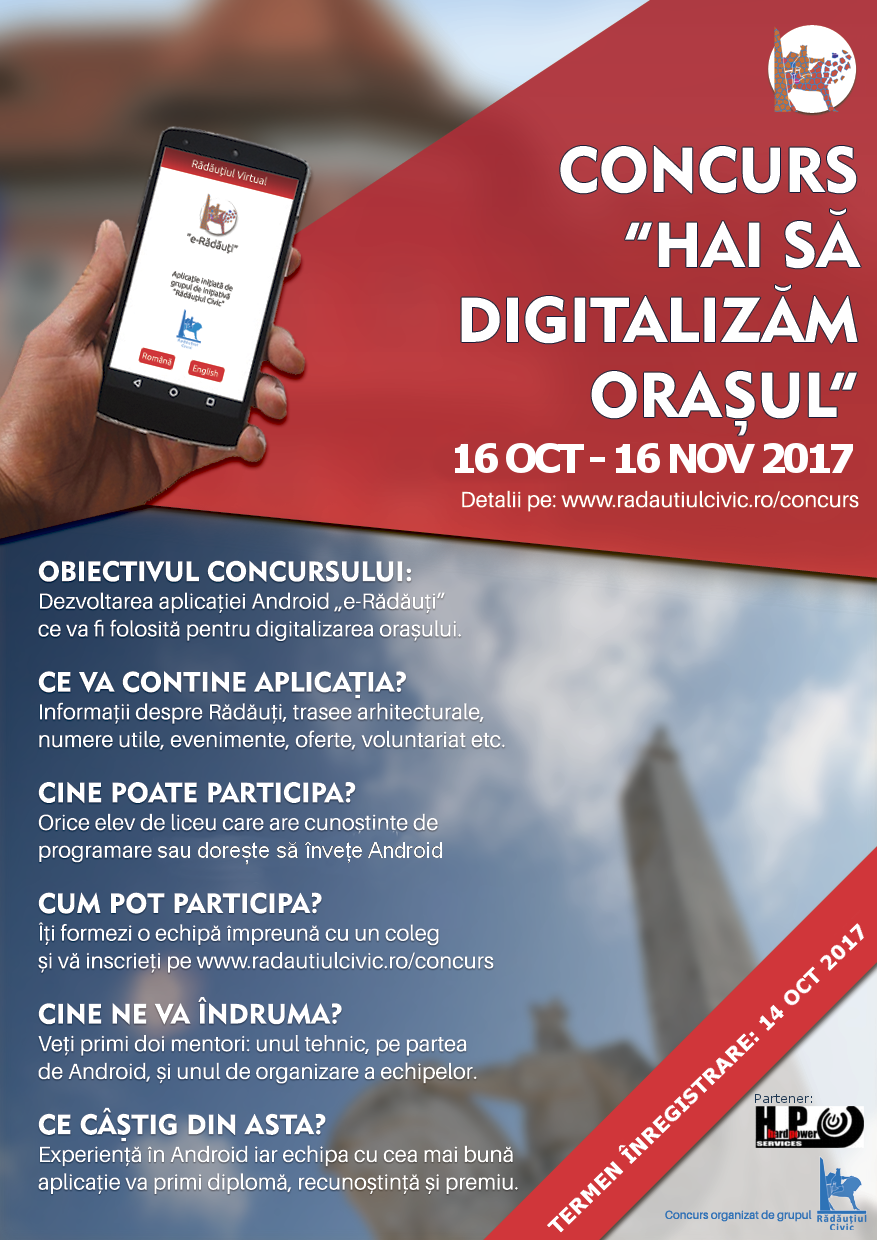 de cetățeni. Lansăm astăzi concursul numit „Hai să digitalizăm orașul”, concurs dedicat elevilor cu aptitudini IT din liceele din Municipiul Rădăuți. Derulat în parteneriat cu HardPower Rădăuți, acest concurs este o premieră la nivel național, o colaborare între societatea civilă, mediul privat și mediul academic și are în vedere dezvoltarea unei aplicații Android pentru cetățenii din Rădăuți, dar și pentru turiștii care ne calcă meleagurile.