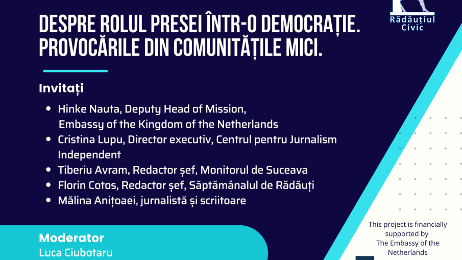 Cu ocazia Zilei Internaționale a Drepturilor Omului, Asociația Rădăuțiul Civic și-a propus să aducă în atenția publicului un subiect de o importanță deosebită pentru dezvoltarea unui stat democratic, rolul presei într-o democrație, dar mai ales, provocările de la nivelul comunităților mici.